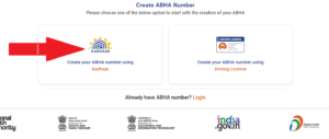 👉 મિત્રો ત્યાર પછી તમને ત્યાં ABHA કાર્ડ બનાવવા માટે બે ઓપ્શન જોવા મળશે અને બે માંથી ગમે તે એક પર ક્લીક કરીને આગળ વધો.